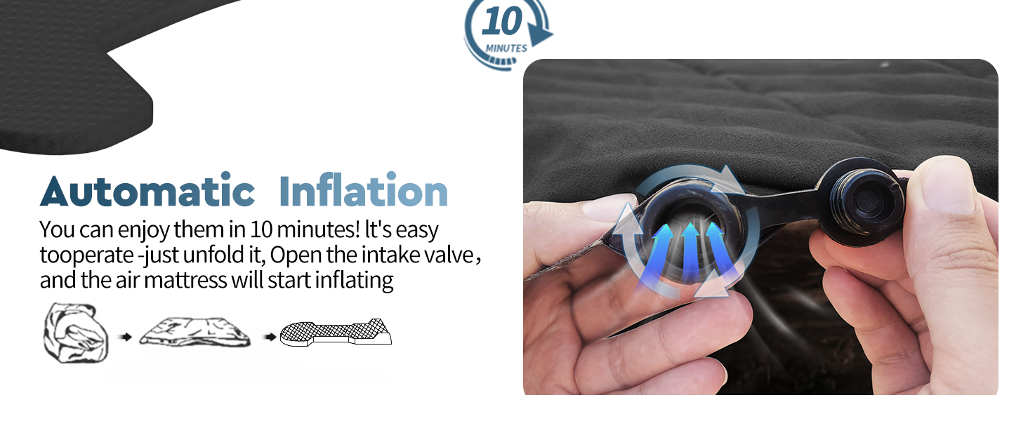 - Effortless Inflation & Deflation: Our Tesla Model Y camping bed features a 2-layer inflation valve for hassle-free setup. Simply twist the valve, and the mattress inflates itself in 5-10 minutes—no extra pump needed. For even faster inflation or deflation, use the portable electric pump to be ready in just 2 minutes. Plus, the advanced valve design reduces air leakage by 30% compared to traditional car mattresses, ensuring a more reliable and comfortable sleep on all your adventures.