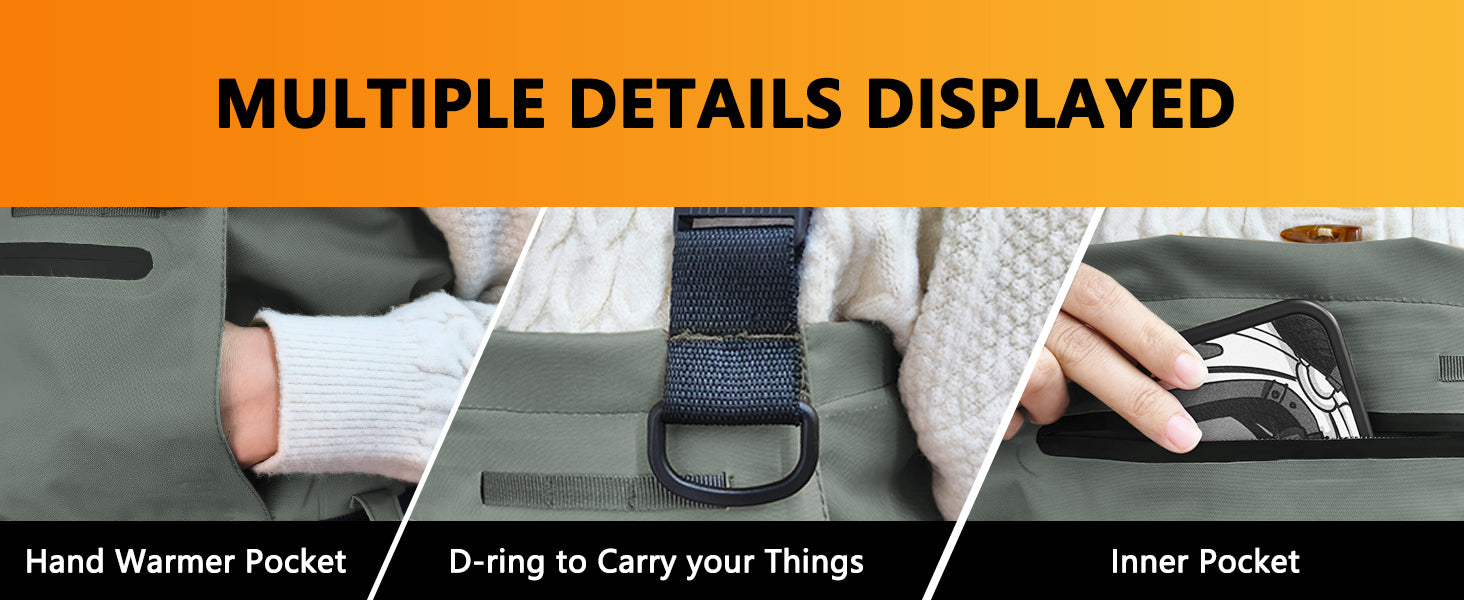 Features a fleece-lined handwarmer pocket, zippered chest pouch, and D‑rings for your tools. Perfect for fishing, duck hunting, car washing, and farm chores.